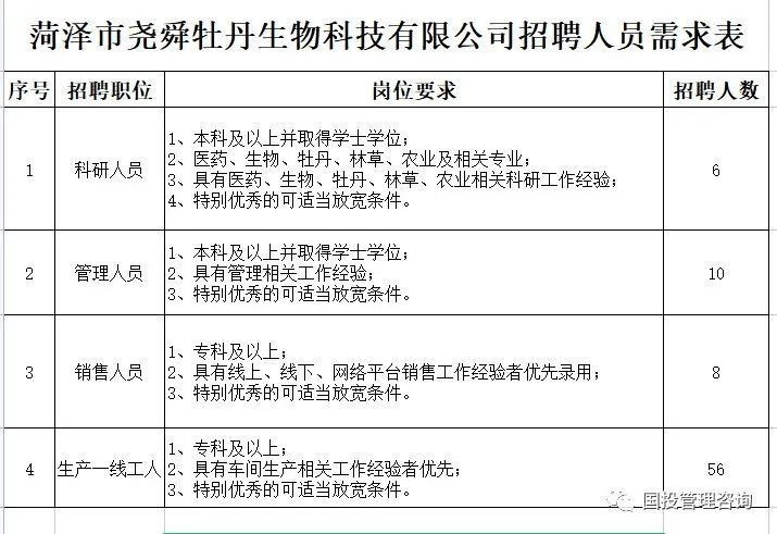 菏澤堯舜牡丹生物科技有限公司為滿足企業(yè)發(fā)展需要,不斷加強(qiáng)人才隊(duì)伍建設(shè),促進(jìn)公司業(yè)務(wù)快速良好開(kāi)展,擬委托菏澤國(guó)投管理咨詢有限公司面向社會(huì)公開(kāi)招聘80名工作人員。具體公告如下:
